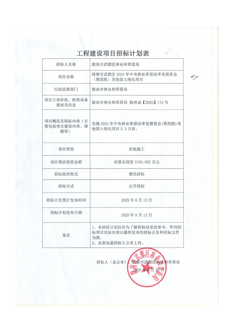 隴南市武都區(qū)2024年中央林業(yè)草原改革發(fā)展資金(第四批)其他國土綠化項目